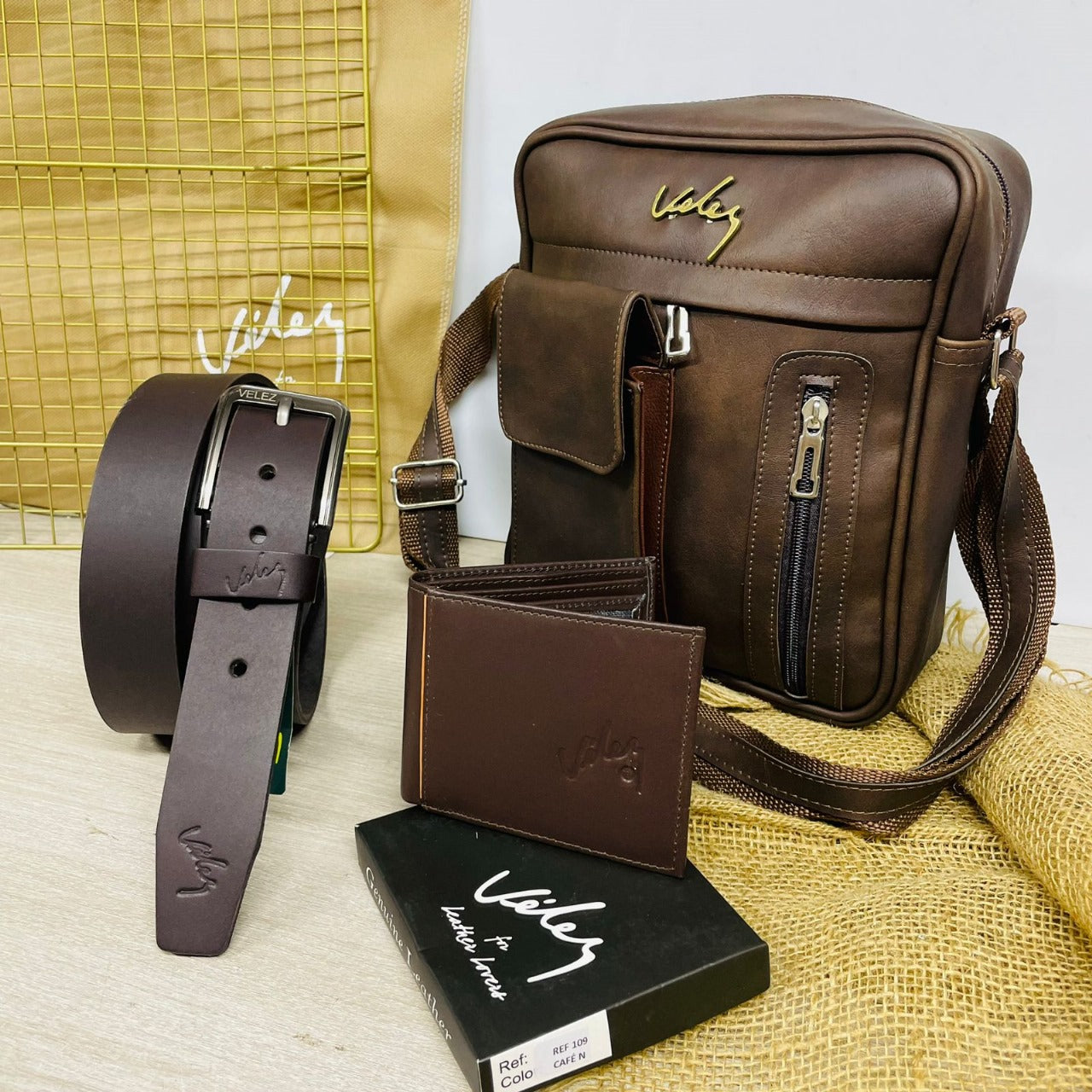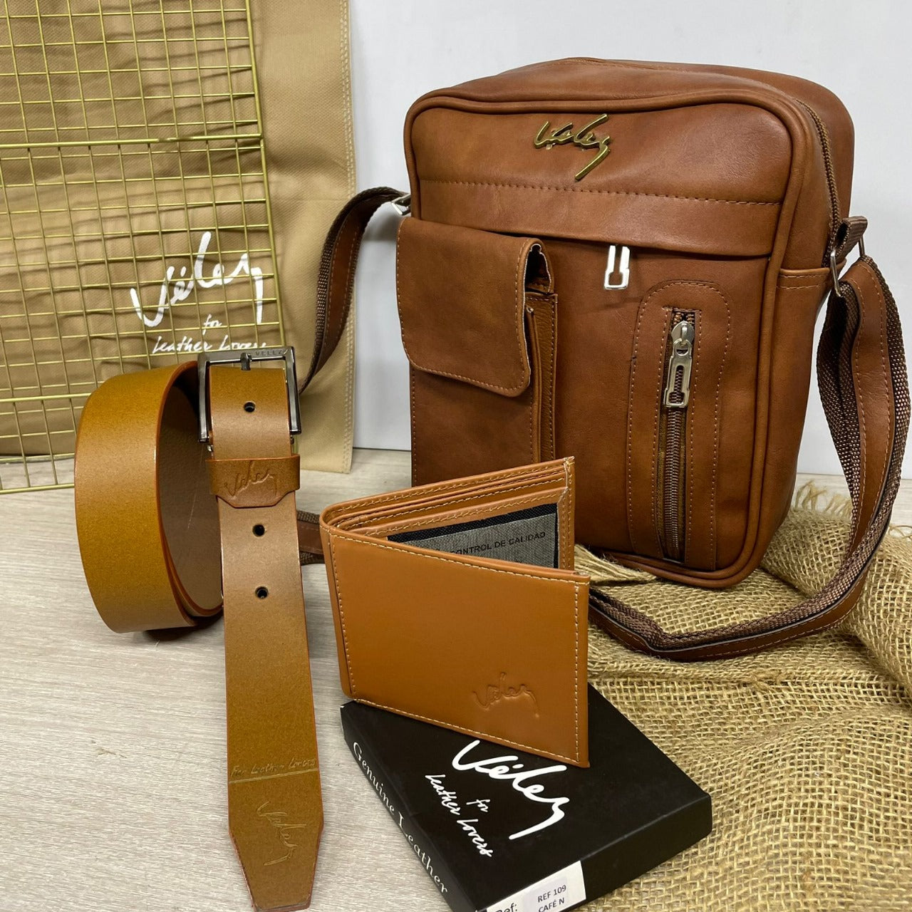 Cada combo se entrega en una tula de lujo color marrón, marcada con el sello Vélez, ideal para regalar o lucir con distinción.